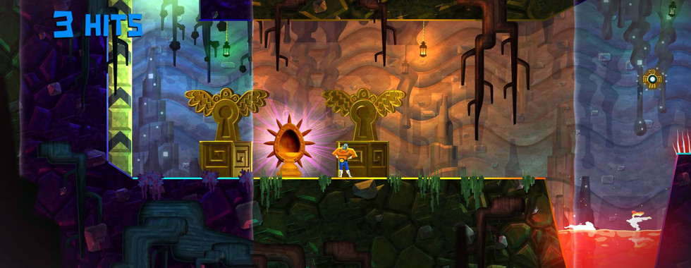The game still radiates a crapload of charm, using cutscenes and dialogue to tell jokes while also keeping Juan on the path to confront his main enemy, luchador Salvador. Salvador is from an alternate timeline where the original Juan loses the final battle in the first Guacamelee. He's a hero who picks up dead-Juan's luchador mask and saves the world. While the first game's timeline goes on with Juan and Lupita having a family, Salvador is corrupted in his timeline and ultimately chases power that leads him to cross timelines collecting relics to make...'the sacred guacamole,' which unites all timelines but ultimately can destroy them too. It's clear the writers are being flagrant about the MacGuffin and just calling this plot-spurring item whatever the hell they want to because it really doesn't matter. The game is fun as hell and all the parts are well done. The platforming is really dynamic and the puzzles can be extremely frustrating, but are also mercifully short. A lot of them are clever and you can just marvel at how many scenarios the developers made out of a few different mechanics.